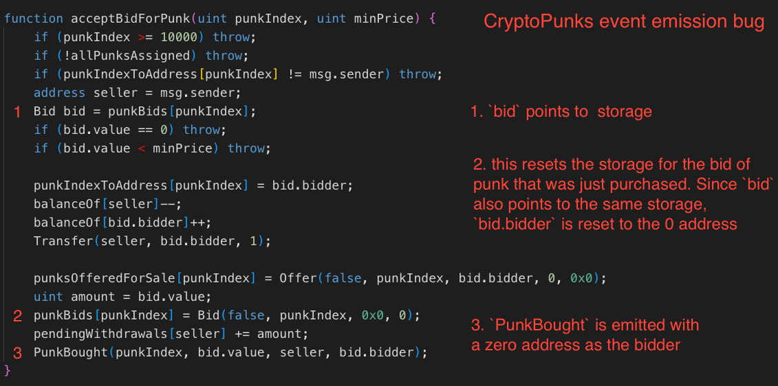 If the PunkBought event had been 2 lines up it would have been emitted correctly but instead the bidder